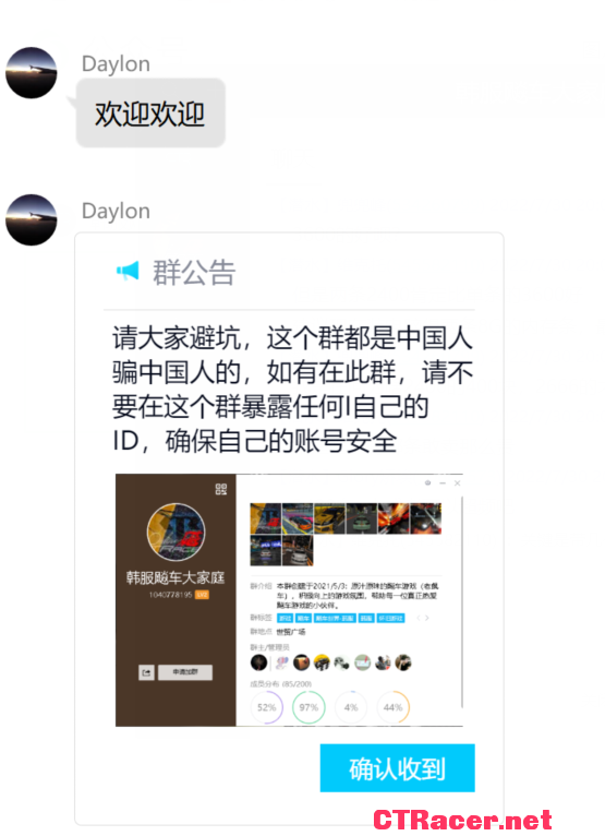 我听到这个消息,我最担心的一刻还是发生了,我bb,车友,各大新老人帮助各种玩家快速上手韩服,但是还是有国人诋毁我们。诋毁的群虽然不是晶莹论坛主群,但是作为管理我可以很认真的告诉大家,韩服飚车大家庭(1040778195)从来不欺骗任何玩家,。你只要玩就会告知大家哪里购买账号,哪里下载游戏,如何汉化,但是下群却严重诋毁韩服飚车大家庭(1040778195)